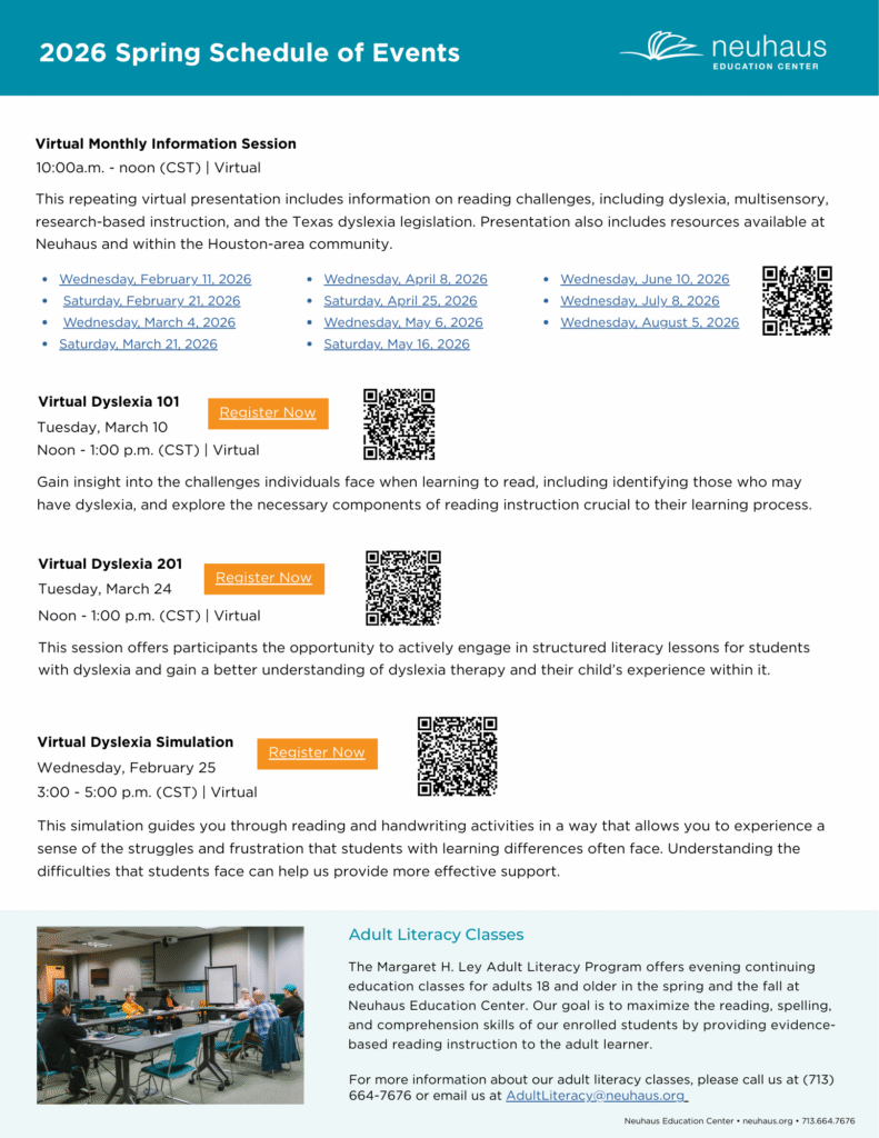 Home is where literacy takes root, and when a child struggles with reading, the search for answers and specialists trained in detecting learning differences can be difficult and intimidating. Neuhaus Education Center resources and referral services provide families with a welcome first step in unlocking a path to reading success.